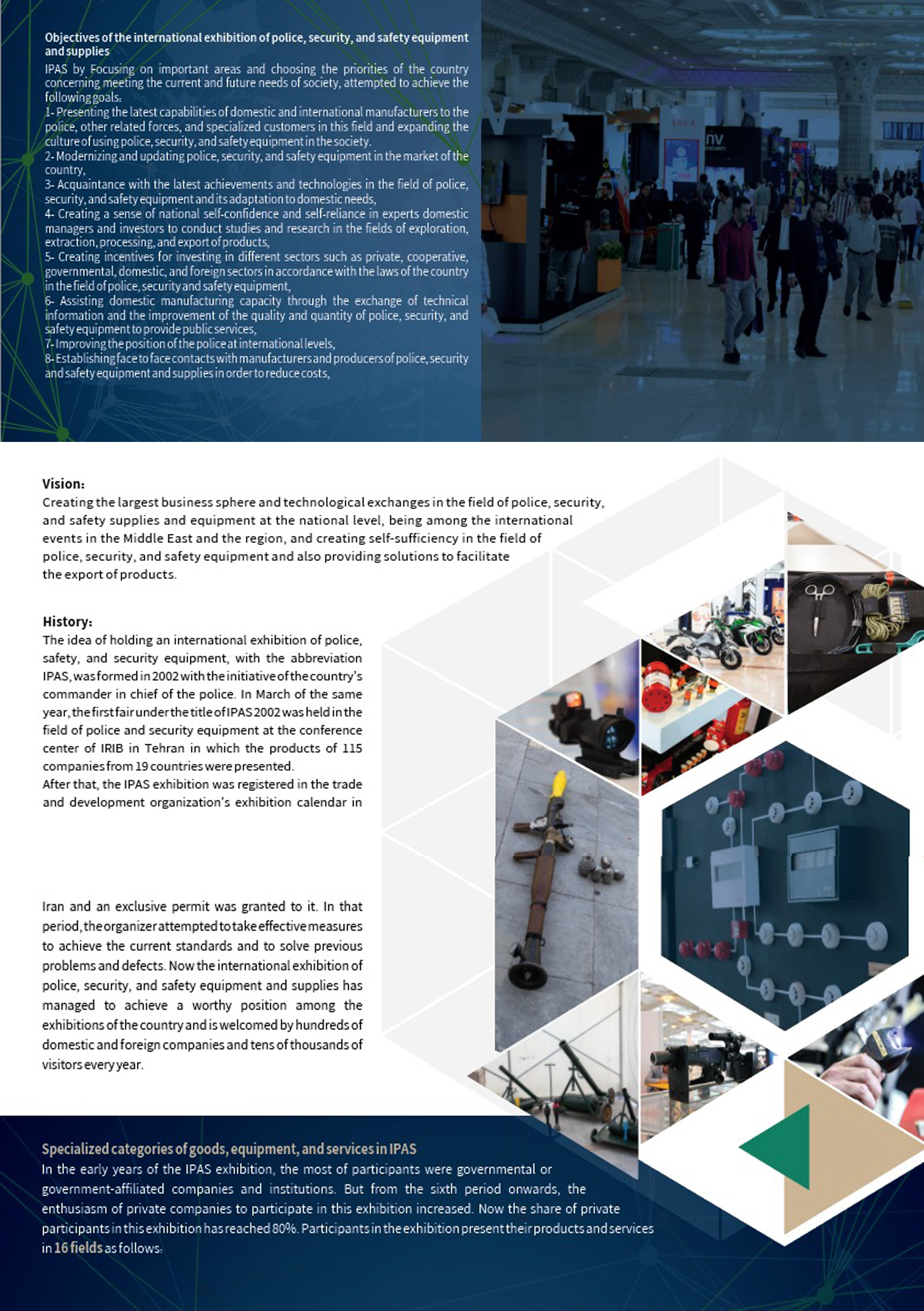 IPAS safety, security and police equipment exhibition is a unique event with the aim of introducing the latest achievements and technologies related to social protection. The exhibition serves as a bridge between equipment manufacturers and those responsible for safety and security. From urban and traffic safety equipment to advanced technologies in the field of criminal investigation, this exhibition provides a platform for exchanging ideas and improving the level of community safety.
